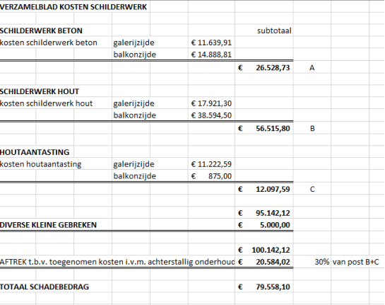 4.29.De rechtbank heeft bij het vorenoverwogene in aanmerking genomen dat partijen het niet eens zijn met het door de gerechtsdeskundige toegepaste (percentage) aftrek nieuw-voor-oud. De argumenten van partijen zijn echter van onvoldoende gewicht om het door de gerechtsdeskundige toegepaste percentage bij te stellen. De gerechtsdeskundige heeft de argumenten van de VvE, inhoudende dat naar maatstaven van redelijkheid en billijkheid onaanvaardbaar is dat er een aftrek nieuw-voor-oud in aanmerking genomen wordt, als volgt onderbouwd weerlegd (deskundigenrapport, randnr. 7.71). Vanaf het gereedkomen van het schilderwerk op het houtwerk is op geen enkele wijze door de VvE periodiek onderhoud aan dit schilderwerk uitgevoerd, terwijl dit wel gebruikelijk is. Dit onderhoud dient te omvatten: het periodiek (jaarlijks) inspecteren en plaatselijk repareren en bijwerken. Door dit onderhoud achterwege te laten is het schadebeeld verergerd en heeft de gerechtsdeskundige op goede grond, ter compensatie daarvan, in de kostenopstelling van de schade, een indexcijfer verwerkt ter compensatie van gestegen kosten. In de reductie met 30% zijn mede de gestegen kosten ten opzichte van de uitgangssituatie verwerkt. De rechtbank ziet dan ook, met de gerechtsdeskundige, geen aanleiding om dit percentage neerwaarts bij te stellen.