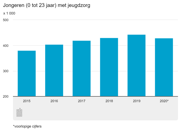 In 2020 ontvingen 429,2 duizend jongeren jeugdzorg, ruim 14,3 duizend minder dan in 2019. Van de verschillende vormen van jeugdzorg daalde het aantal jongeren met jeugdhulp van 431,0 duizend in 2019 naar 416,7 duizend in 2020. Het aantal jongeren dat jeugdbescherming kreeg bleef nagenoeg gelijk, in beide jaren 41,1 duizend. Het aantal jongeren met jeugdreclassering daalde van 9,1 duizend in 2019 naar 8,5 duizend in 2020. Jongeren kunnen in een jaar meerdere vormen van jeugdzorg krijgen.