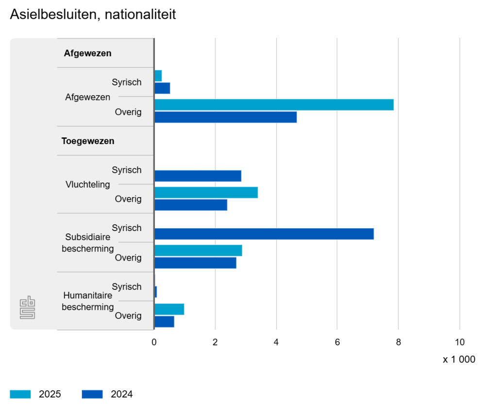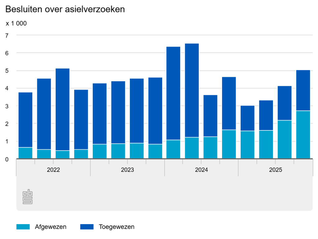 In 2025 zijn 56 procent meer asielaanvragen afgewezen dan een jaar eerder. Ook zijn 27 procent (5,6 duizend) minder eerste besluiten genomen over een asielverzoek. Dit meldt het Centraal Bureau voor Statistiek (CBS) op basis van nieuwe cijfers over asielbesluiten van de Immigratie- en Naturalisatiedienst (IND).