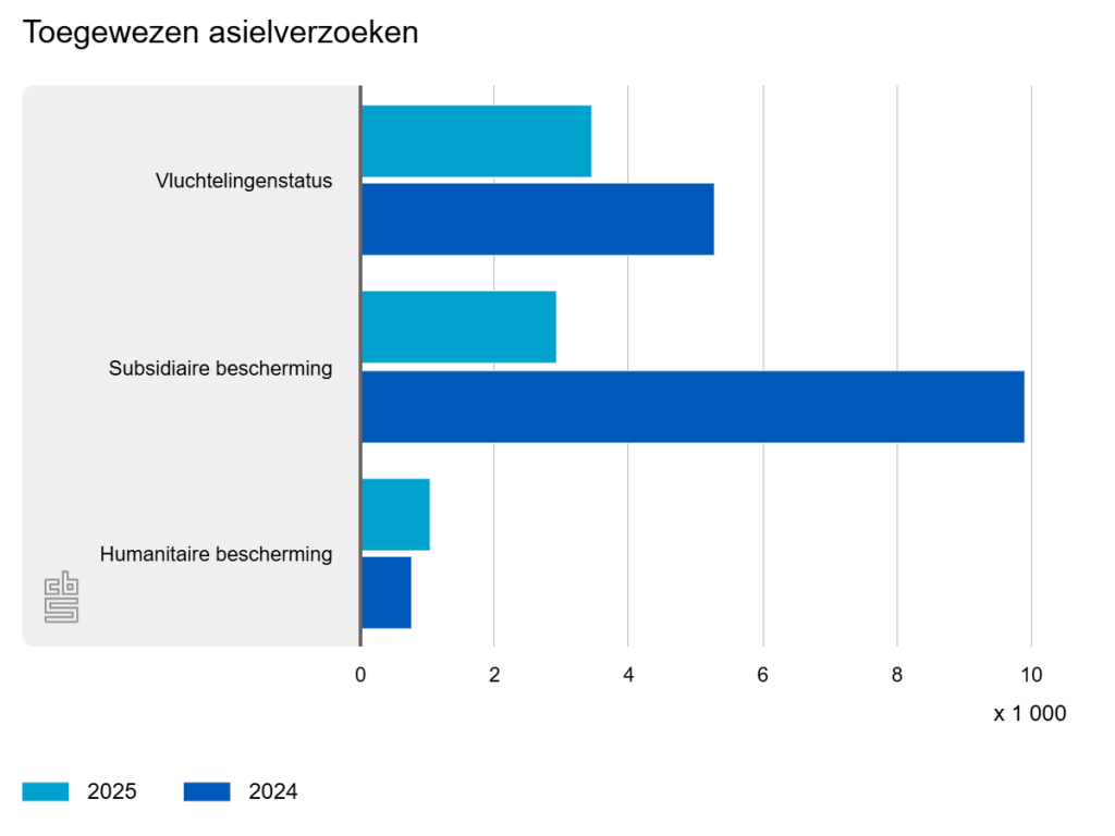 In 2025 zijn 70 procent minder asielaanvragen toegewezen op grond van subsidiaire bescherming vergeleken met een jaar eerder. Dit is een vorm van bescherming voor mensen die niet in aanmerking komen voor de vluchtelingenstatus, maar wel ernstige risico’s lopen bij terugkeer naar hun land van herkomst. In 2025 kregen 2,9 duizend mensen een asielvergunning op basis van subsidiaire bescherming, 7,0 duizend minder dan een jaar eerder.