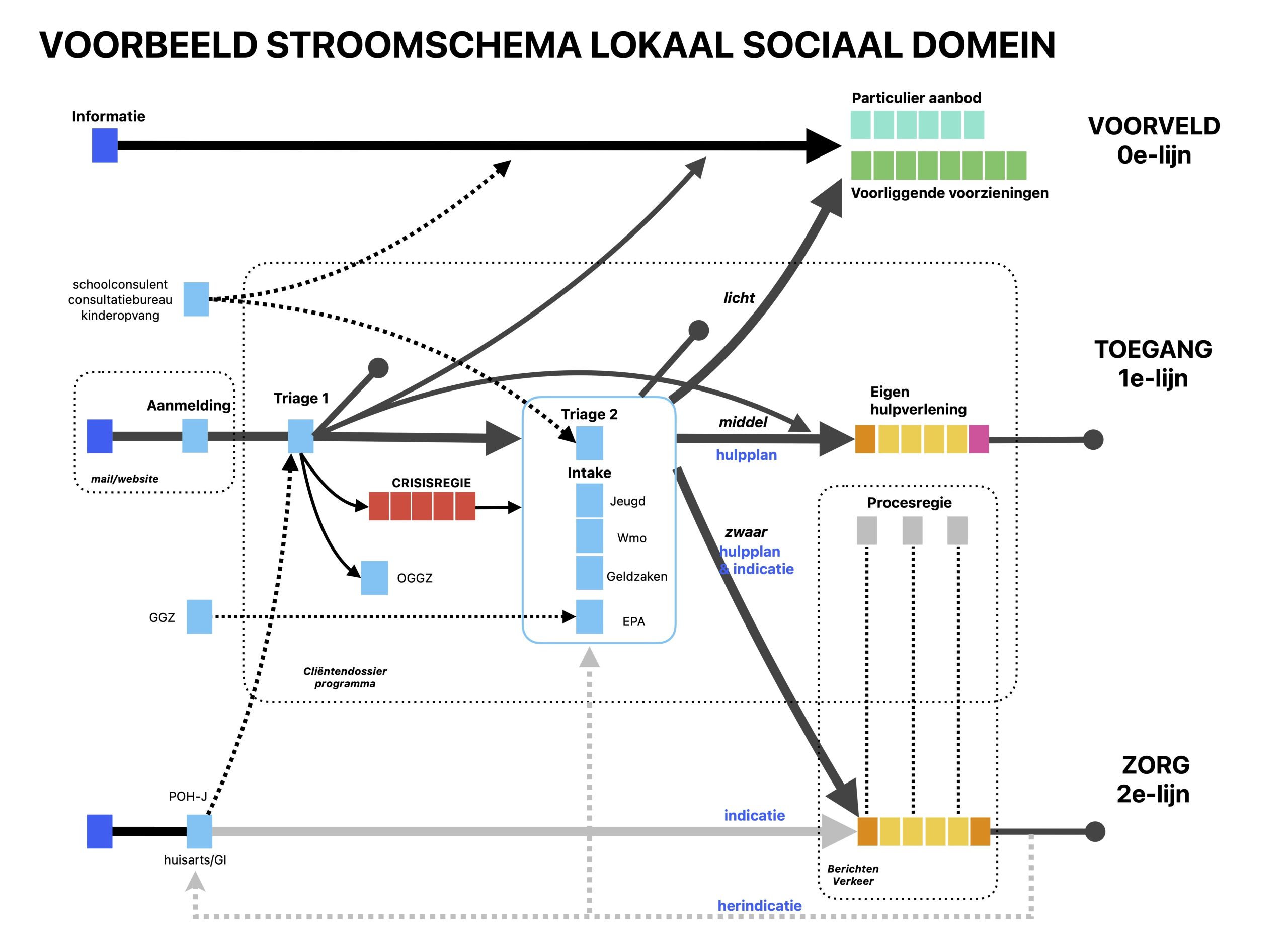 Stap 1: maak het stroomschema voor de lokale situatie. Dit brengt de huidige stromen rondom de Toegang (Jeugd, Wmo en WGS) in kaart. Het is een abstracte cliëntreis door het voorveld (0-de lijn), de Toegang met de eigen hulpverlening (1e-lijn) en de geïndiceerde zorg en ondersteuning (2e-lijn). Veel KPI's gaan over die stromen, zoals aantallen aanmeldingen en indicaties, wettelijke termijnen van